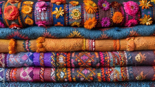Colorful stacked handmade blankets with vibrant floral accents