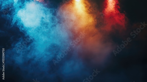 Colorful stage lights illuminating smoke with abstract blurred bokeh effect creating a vibrant and dynamic performance atmosphere.