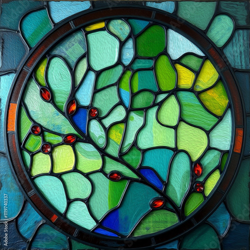 Colorful stained glass window. Botanical pattern. Multicolored interior design template. Oil painting