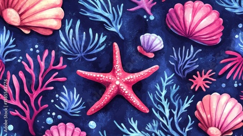 Colorful starfish, seashells, and seaweed on a dark blue background.