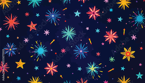 Colorful Stars and Fireworks Pattern on Dark Blue Background Festive Celebration
