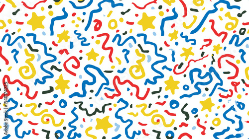 Colorful stars and streamers scatter across festive bright white background.