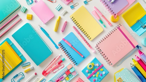 Colorful stationery arrangement featuring notebooks, pens, paperclips, and more, perfect for office or school inspiration.