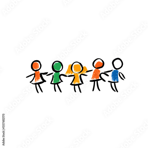 Colorful stick figures of three happy people celebrating, perfect for fun or community themes, on a white and transparent background, PNG.