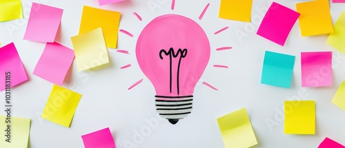 Colorful sticky notes around a light bulb drawing on a white background, symbolizing creativity and brainstorming ideas.
