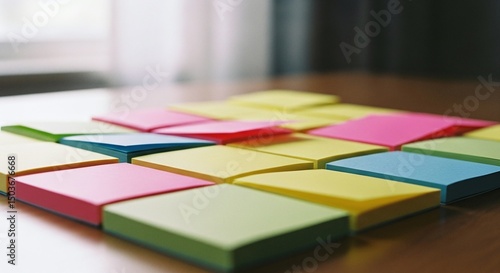 Colorful sticky notes arranged in a grid on a wooden table near a window. The notes are various bright colors