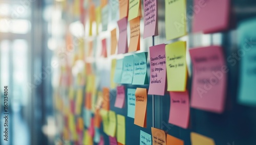 Colorful Sticky Notes Hanging on Office Wall with Handwritten Words, Vibrant Post-it Note Background for Creative Workspace Inspiration