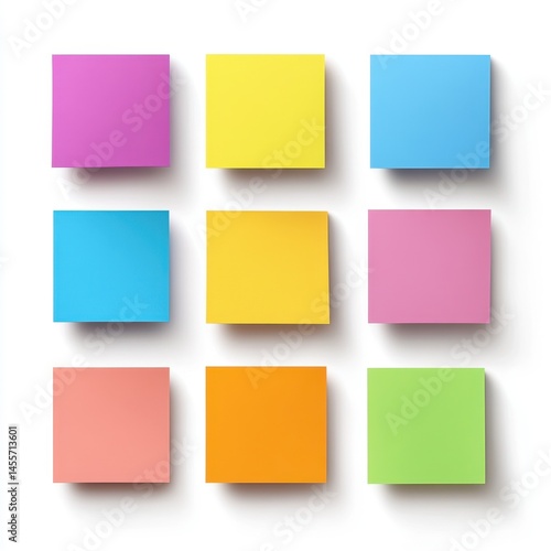 Colorful sticky notes in various colors arranged on a white background for organization and note-taking purposes
