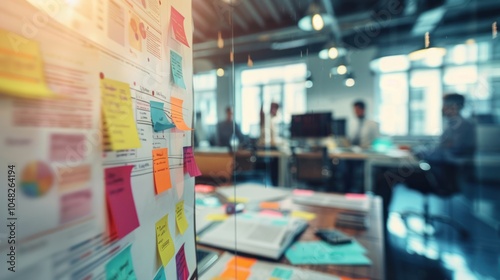 Colorful Sticky Notes on a Whiteboard in a Blurred Office Setting