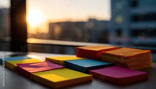 Colorful sticky notes stacked on a table, city sunset view