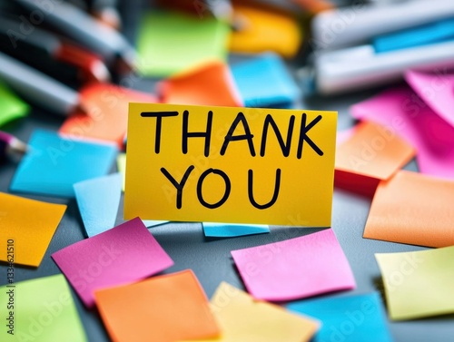 Colorful sticky notes with a prominent "Thank You" message in the center, surrounded by markers.