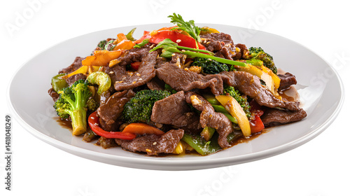 Colorful Stir-Fried Beef and Vegetables Served on a White Plate with Fresh Herbs Garnish