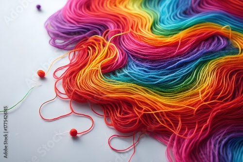 Colorful strands of rainbow yarn arranged in a vibrant, flowing pattern