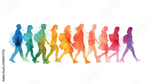 Colorful student silhouettes walking in a row