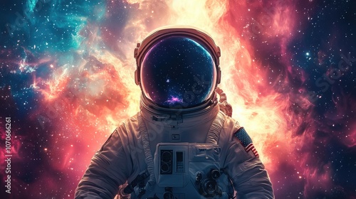 Colorful Stylized Astronaut in Space Illustration – Artistic Depiction of a Futuristic Space Explorer Against a Nebula-Filled Background, Merging Cosmic Adventure and Creativity in Vivid Colors