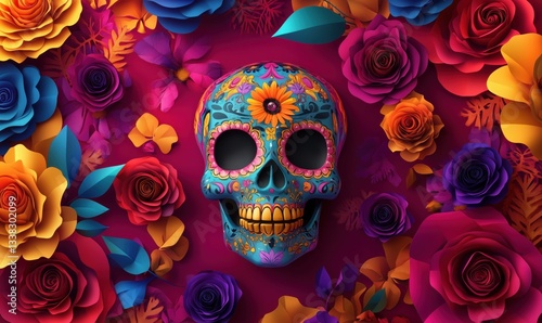Colorful sugar skull surrounded by vibrant flowers and foliage for Day of the Dead celebration