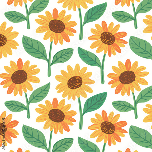 Colorful sunflower pattern with bright yellow flowers and green leaves.