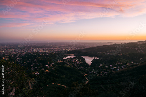 Colorful Sunset over Los Angeles Skyline seen from Griffith Park, California