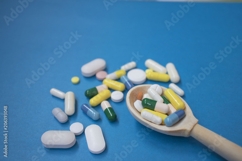Colorful tablets and pills in wooden spoon. Pharmaceutical pills in wooden spoon on blue background. copy space
