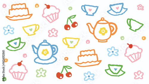 Colorful tea party with teapots, cakes, cupcakes, cherries and flowers doodle pattern design