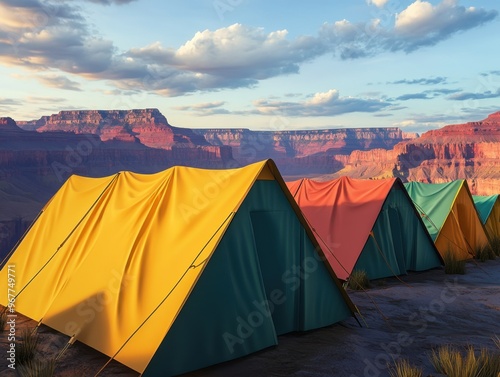 Colorful tents set against the breathtaking backdrop of the Grand Canyon at sunset, perfect for outdoor and adventure themes.