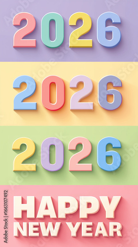 colorful text "2026" and "Happy New Year" background for graphic design element, New Year celebration concept. Happy holiday greeting card template. Pastel background.