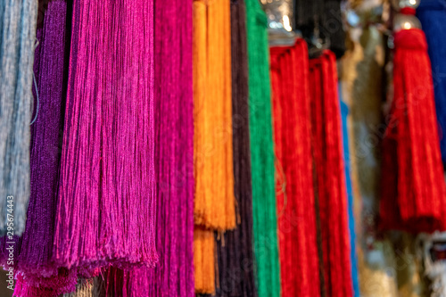 Colorful textiles hanging before being used for textiles