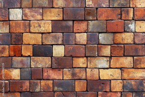 Colorful textured brick wall pattern with varying shades of red and brown in a rustic design