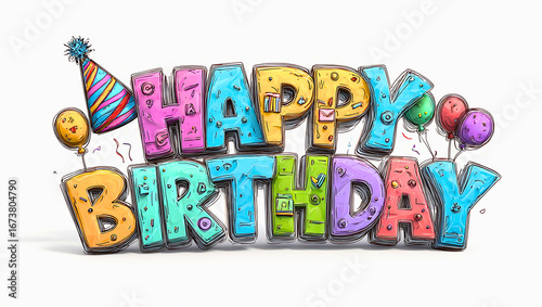 Colorful textured happy birthday text with party hat and balloons on white background