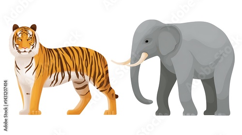 Colorful tiger and majestic elephant illustration for wildlife and animal conservation themes