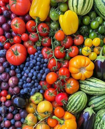 Colorful top view of various kinds of fruits and vegetables. Generative AI.