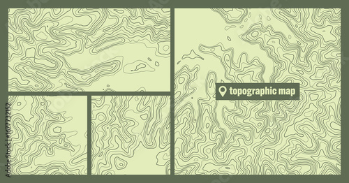 Colorful topographic map sets with contour lines. Geographic terrain grid, relief height elevation. Ground path pattern. Travel and navigation, cartography design element. Vector illustration