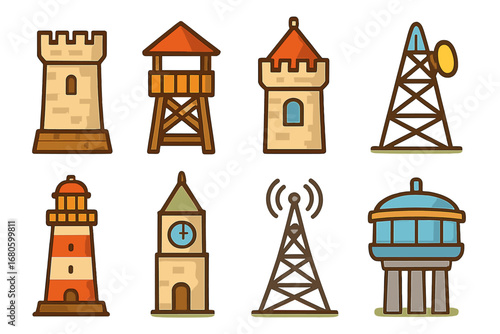 Colorful Tower Icons. Flat vector mini-illustrations tower in colors children's illustrations: medieval stone tower, watchtower,