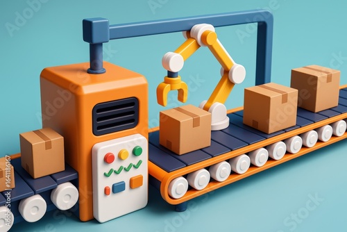 Colorful Toy Factory's robotic arm carefully lifts a packaged box from conveyor, symbolizing innovation and automated efficiency in playful digital art.