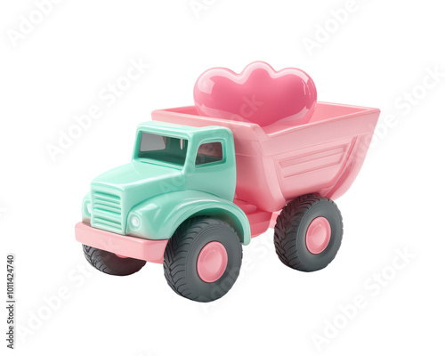 Colorful toy truck with heart-shaped cargo, white isolated background.