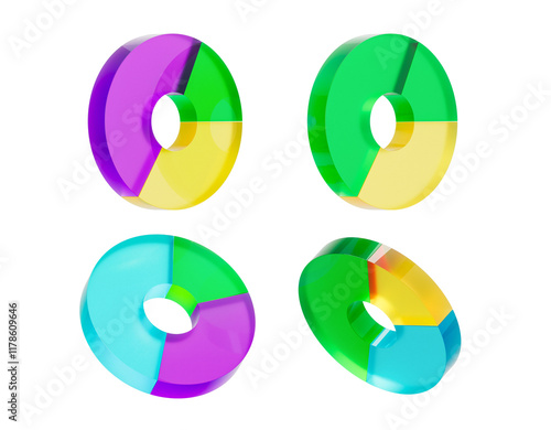 Colorful translucent 3D pie charts with segmented pieces, floating on a white background. Concept of data representation, analysis, and statistics. 3D Rendering.