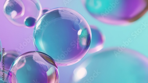 Colorful transparent bubbles floating in soft purple-blue gradient with light halos, dreamy ethereal atmosphere.