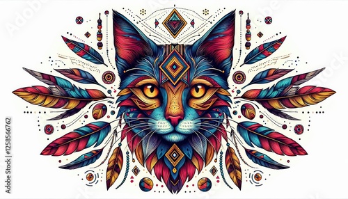 Colorful tribal feline explosion in a symmetrical geometric art illustration