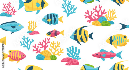 Colorful Tropical Fish and Coral Reef Pattern on White Background