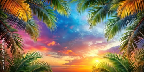 Colorful Tropical Frame with Palm Leaves against a Vibrant Sky, bright sky