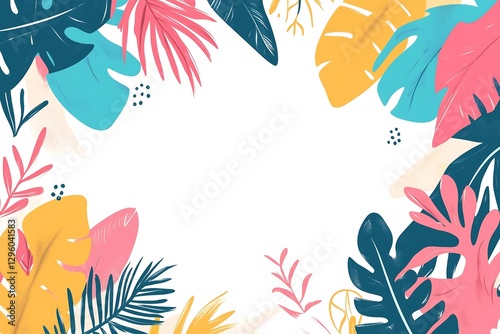 Colorful tropical leaves create a vibrant border around a blank space, ideal for text or designs.