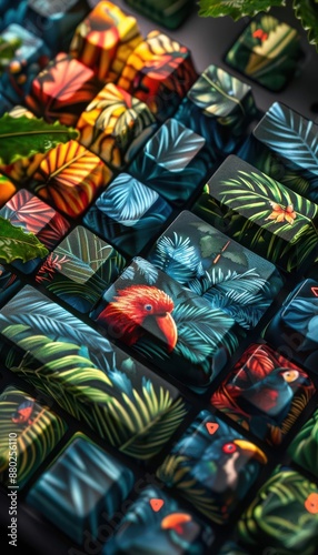 Colorful tropical-themed keycaps featuring vibrant parrots and leaves, offering a unique and artistic touch to any keyboard setup.