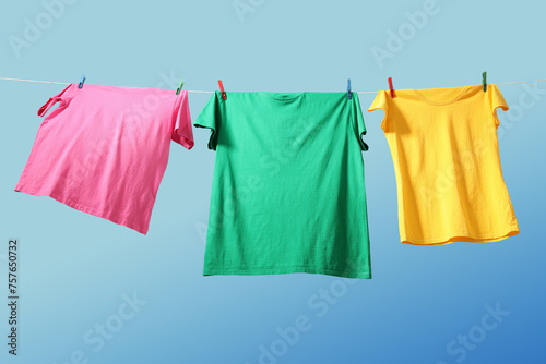 Colorful t-shirts drying on washing line against blue sky