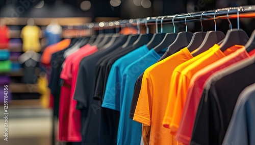 Colorful T-shirts on racks in a clothing store