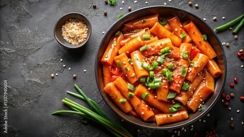 Colorful Tteokbokki noodles in a spicy sauce on a dark background with sesame seeds and chopped green onions , Spicy Korean street food, Sauce