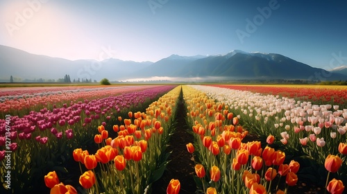 Colorful tulip fields at sunrise, mountain backdrop, spring landscape, postcard.