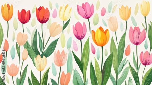 Colorful Tulips Watercolor Illustration: A vibrant and cheerful watercolor illustration of a field of tulips in various shades of pink, yellow, red, and orange. The image evokes feelings of spring.
