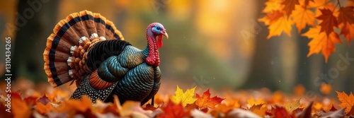 Colorful turkey surrounded by autumn leaves in a festive setting, , autumn, fall foliage