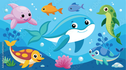 Colorful underwater illustration featuring playful sea creatures swimming in a vibrant ocean setting filled with bubbles and coral