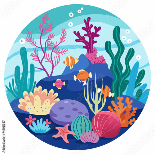 Colorful Underwater Scene with Fish, Coral, and Sea Life